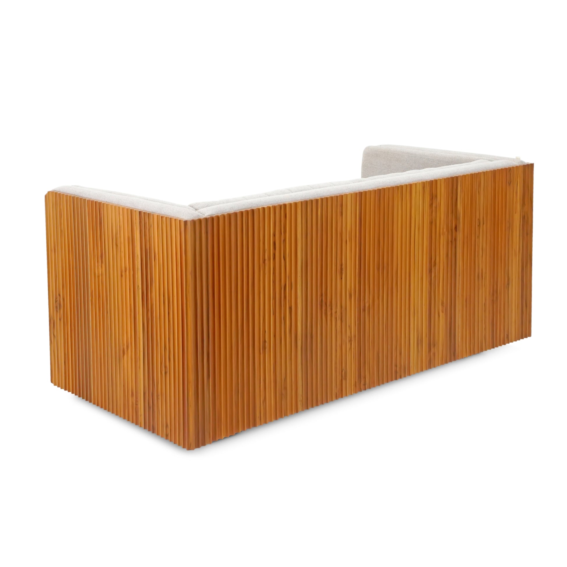 The Modern Ebony Sofa combines contemporary design with timeless craftsmanship. Featuring a plush, light gray upholstered body with vertical channel tufting for added comfort and style, this Sofa is accented by rich wooden side panels and sturdy wooden legs. The vertical slat design on the sides adds a unique texture, making it a perfect blend of sophistication and functionality for any living space.